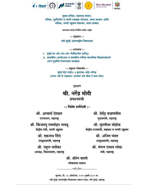 मुंबई : आदरणीय पंतप्रधान श्री.नरेंद्र मोदीजी आणि माननीय मुख्यमंत्री श्री.देवेंद्रजी फडणवीस यांच्या प्रयत्नांतून नवी मुंबई येथे साकार झालेल्या आंतरराष्ट्रीय विमानतळाचे मा.पंतप्रधान श्री.नरेंद्र मोदीजी यांच्या शुभहस्ते उद्या उदघाटन होत आहे.